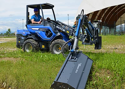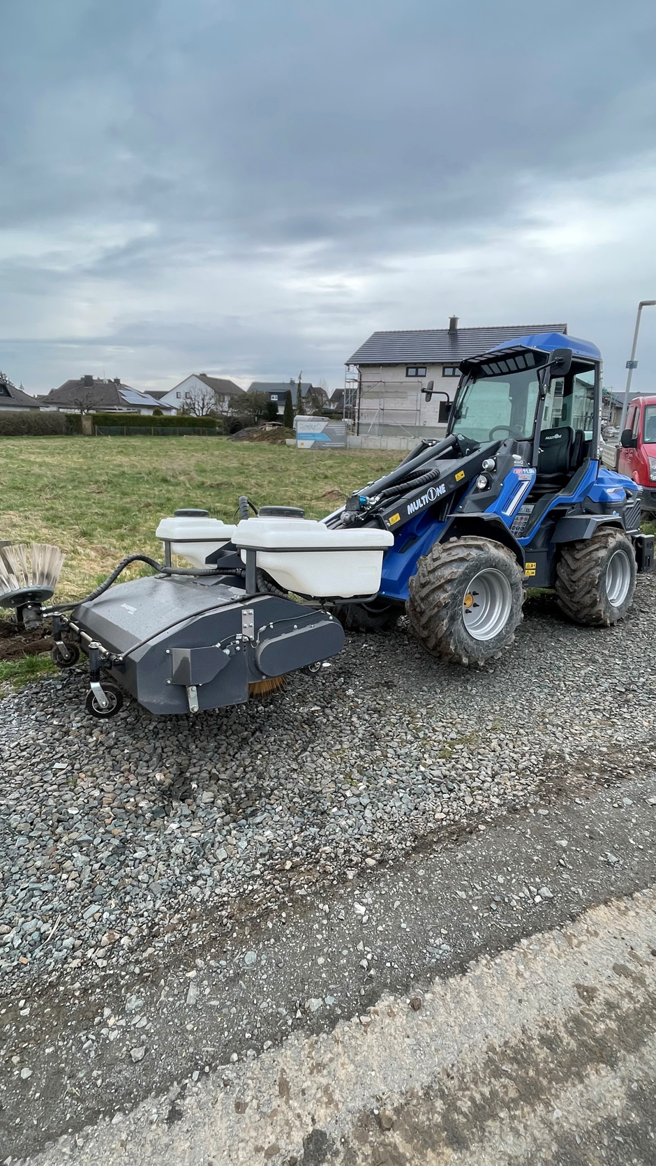 Sein sinnvolles Credo, „gutes Werkzeug für gute Mitarbeiter“ hat der Sauerländer übrigens auch bei der Beschaffung seines MultiOne-11.9-Multifunktionsladers en détail umgesetzt. Neben einer hochwertigen Maschinenausstattung und Komfortkabine samt Klimaanlage stattet Henze den agilen Kraftprotz mit diversen Anbaugeräten aus: Palettengabel, 4-1-Schaufel, Umkehrfräse, Siebschaufel, Beton-Mischschaufel, Kegelbrecher sowie Auslegermulcher lassen den 11.9 zum schier unschlagbaren Multi-Tool geraten. Und dem nicht genug: Lediglich fünf Monate später beschafft der Jung-Unternehmer auf der AGRITECHNICA eine Kehrmaschine mit Wassertank und Sprüheinrichtung aus dem Hause MultiOne. Insgesamt investiert Henze in den blauen Multifunktionslader und die Profi- Anbaugeräte somit knapp über 100.000 Euro.