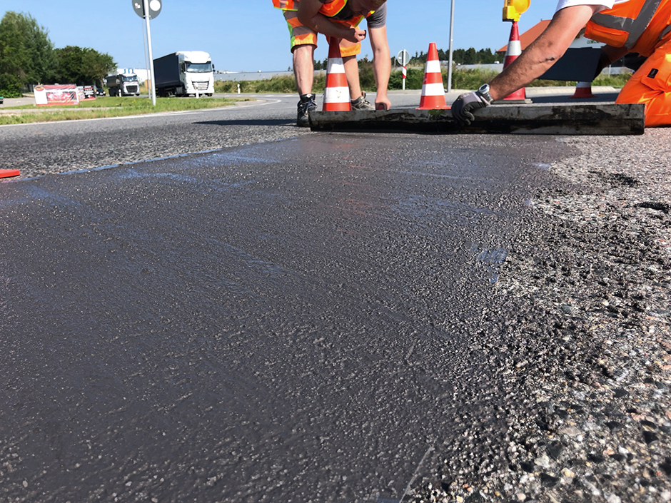 Die Verarbeitung ist auch bei niedrigen Temperaturen möglich. Flüssig Asphalt HD ist hoch abriebfest und dauerhaft griffig, ein nachträgliches Abstreuen entfällt. Bis zu 30 mm in einer Schicht kann der Reparaturmörtel eingebaut werden. Nach einer zweijährigen Testphase steht den Anwendern nun ein Sanierungsmaterial zur Verfügung, mit dem sich auch anspruchsvolle Schadensbilder in hochbelasteten Flächen langfristig sanieren lassen.