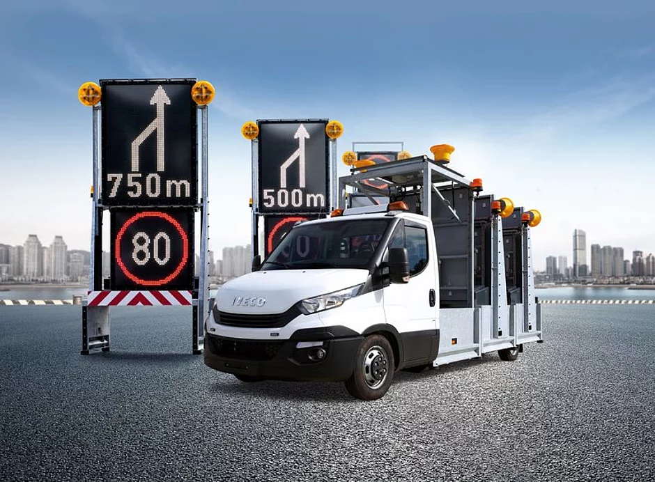 Der neue Drop & Pick Van bietet eine Lösung für gleich zwei Herausforderungen: die Absicherung von Arbeitsstellen im Straßenverkehr bei gleichzeitiger maximaler Sicherheit des Fachpersonals. Dabei werden einzelne Module mit LED-Tafeln oder Zeichen 616 zum Einsatzort transportiert, automatisch abgesetzt und wieder aufgenommen. Somit ist die komplette Einrichtung einer Arbeitsstelle mit nur einem Fahrzeug und einer Arbeitskraft möglich. Das reduziert Kosten und erhöht durch automatische Abläufe die Arbeitssicherheit, denn ein Eintreten in den Verkehrsraum ist nicht mehr notwendig.