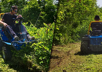 Die Kabine ist äußerst stabil und besitzt eine Dämmschutzmatte zur Reduzierung der Motorgeräusche. Ein klappbarer Flaschenhalter ist ebenso im Lieferumfang enthalten. Zwei LED-Front-Arbeitsscheinwerfer sorgen für die nötige Beleuchtung – speziell in der dunklen Jahreszeit. Eine LED-Rundumleuchte warnt bei den Arbeiten sowohl im Wintereinsatz als auch beim Mulchen. Zum Schutze des Bedieners kann eine halbseitige Frontplexiglasscheibe an das Fahrerverdeck angeschraubt werden.