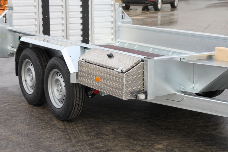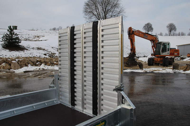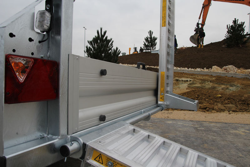 Der Baumaschinenanhänger kann mit einer durchgehenden Rampe mit voller Belastbarkeit über die ganze Fläche passend nachgerüstet werden – und dass für beide Größen. Außerdem passt sich die durchgehende Rampe, aufgrund der innovativen Technik, auch bei unebenem Gelände an die Belastung an. Der neue Baumaschinenanhänger UBA kann zudem mit einer stabilen Baggerarmauflage mit Stauraum sowie einer hochwertigen Aluminium-Staukiste (Maße: 750 x 210 x 280/200 mm) nachgerüstet werden.