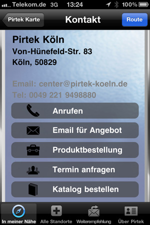 Mit der neuen App beschreitet Pirtek nun eine neue Dimension der Interaktion mit den Kunden. Die Nutzungsmöglichkeiten sind zahlreich: So kann beispielsweise das integrierte GPS des iPhones den Standort des Nutzers orten und anschließend mit den Daten aus der Pirtek App verknüpfen. Ergebnis: Das nächstgelegene Pirtek Center wird in Sekundenschnelle mit entsprechenden Kontakt- und Adressdaten lokalisiert.