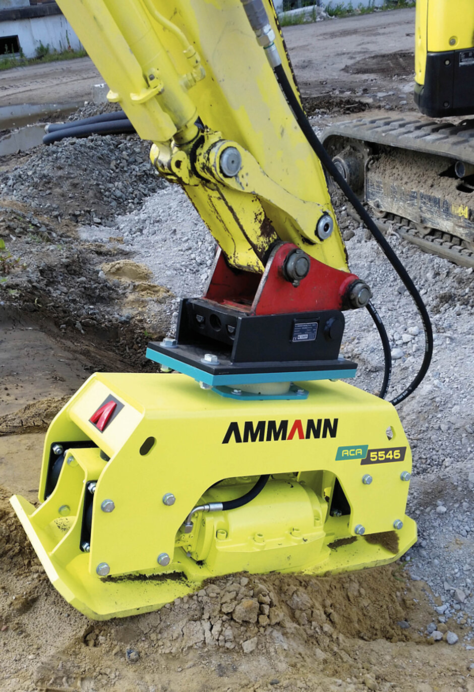 Mit den neuen Anbauverdichtern ACA 5546 und ACA 5556 komplettiert Ammann Verdichtung seine Range der Verdichtungsmaschinen und bietet den optimalen Bodenstabilisierer speziell für beengte Platzverhältnisse. Mit einer maximalen Arbeitsbreite von 46 cm, einer Wuchtkraft von 55 kN und der gerichteten Vibration eignet sich der ACA 5546 ideal für effektives Arbeiten auch im innerstädtischen Bereich sowie an Hängen und Böschungen. Der ACA 5556 hat eine um zehn Zentimeter verbreiterte Grundplatte.