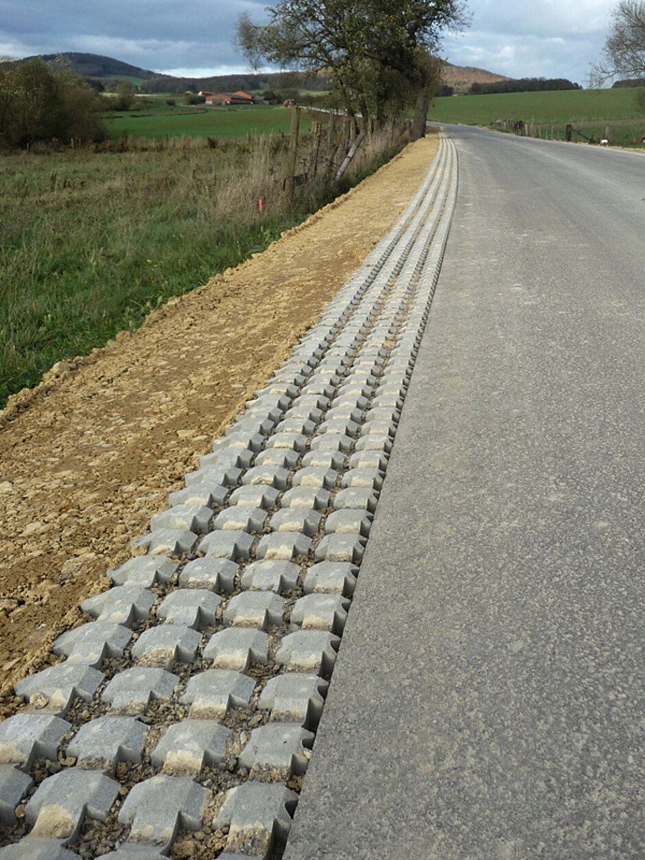 Die aus Beton bestehende Bankettplatte ermöglicht die Befahrbarkeit der Straße über den Fahrbahnrand hinaus. Sie verhindert ein Ausbrechen des Banketts, beispielsweise durch die Einwirkung von Lkw-Reifen, und damit auch ein mögliches Einsinken von Fahrzeugen. Durch eine spezielle Gitterstruktur und die 55 x 55 mm messenden Kammern kann das Niederschlagswasser abfließen; Ausrisse am Fahrbahnrand gehören damit der Vergangenheit an. Dank der vertikalen Verzahnung entsteht in der verlegten Fläche eine hohe Verbundwirkung. Ein weiterer Vorteil der Bankett-Verbundplatte ist die Erhöhung der Leitwirkung für die Verkehrsteilnehmer. Durch die grobe Noppenstruktur der Platten entsteht beim Überfahren ein lautes Abrollgeräusch, der Fahrzeugführer wird gewarnt.