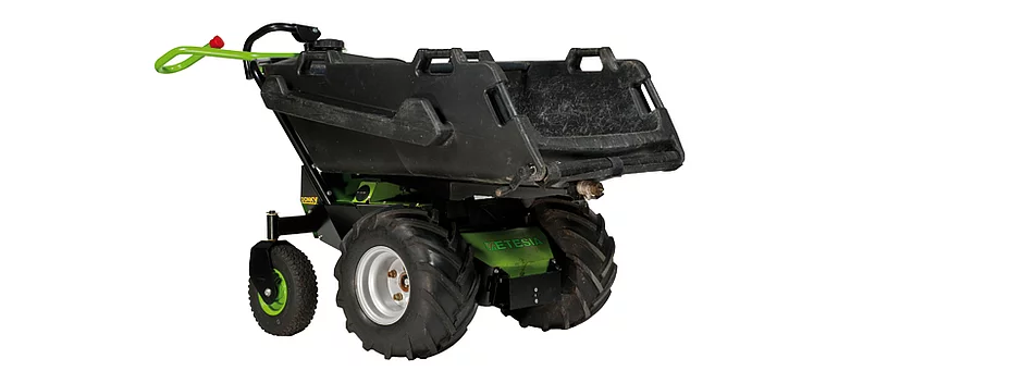 Mit der Elektroschubkarre DONKY® können bis zu 250 kg oder 180 Liter (400 mit Seitenwandzubehör) auf einmal befördert werden, wobei die Leerung mit Zentralhebel unterstützt ist. Mit dem in der Schubkarre integriertem Behälter mit 1-Zoll-Ventil ist es ferner möglich, 85 Liter Wasser oder andere Arten von Flüssigkeiten gleichzeitig zu befördern.
