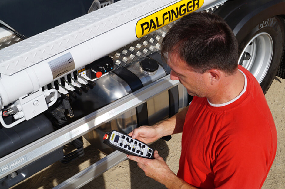 Mit der Funkfernsteuerung können alle Funktionen von Abroll- und Absetzkippern gesteuert werden. Dazu gehört auch die automatische Folgesteuerung, die beispielsweise beim Abrollen eines Behälters vom Einfahren des Unterfahrschutzes über das Öffnen der Verriegelungen bis hin zur Steuerung der Hub- und Teleskopzylinder mit nur einem Knopfdruck steuert. Mit der Funkfernsteuerung entfallen zeitraubende Wegstrecken zwischen Fahrerhaus und Behälter. Da dies bei Absetzkippern mit dem Handling der Ketten besonders wichtig ist, werden alle PALFINGER Absetzkipper serienmäßig mit Funkfernsteuerung geliefert.