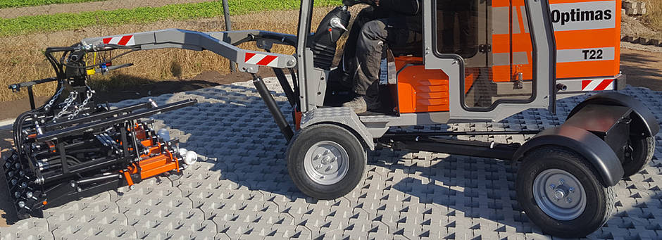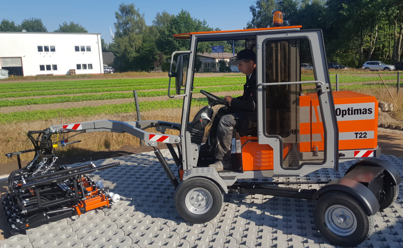 Die Optimas T22 ist dafür konzipiert, maschinelle Pflasterverlegung zu leisten. Sie ist aber nicht als ausschließliche Leistungsmaschine gedacht, sondern für gelegentliche oder kleinere Einsätze. Deshalb ist sie für jeden Baggerfahrer etc. einfach handhabbar. Das heißt, die Funktion Heben und Senken wird mit dem Joystick ausgeführt. Analog zum Bagger. Eine Umgewöhnung ist deshalb nicht notwendig. Damit sie überall guten Zugang hat, wurden die Außenmaße klein gehalten. Nur 2.000 mm Höhe und 1.200 mm Breite geben die Möglichkeit, auch in Tiefgaragen zu arbeiten. Der äußere Wenderadius von 1.900 mm ermöglicht eine sehr gute Manövrierbarkeit. Die T22 kann bei einem Eigengewicht von 1.275 kg insgesamt 400 kg heben und bewegen.