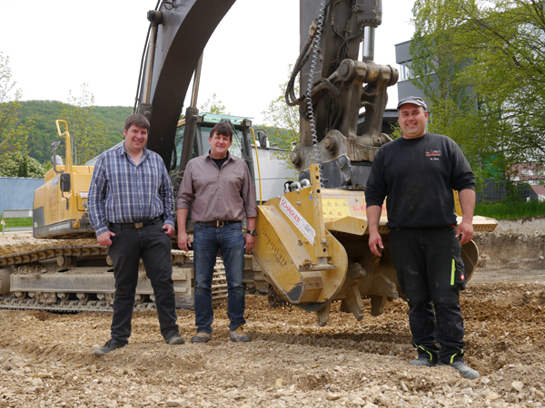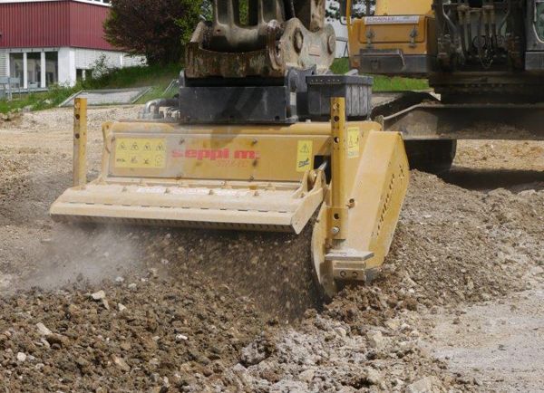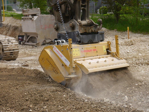 Es handelt sich um die neue „STAR-FC hyd“ von SEPPI M., einer Universalfräse die sich zum Fräsen von Boden, zum Brechen von Steinen und auch zum Zerkleinern von Wurzelstöcken und Holz eignet. Dadurch können die auf der Baustelle schon vorhandenen Bagger in einem Zug mit dem Aushub zum Stabilisieren des Bodens verwendet werden. „Durch die Stabilisierung kann der Austausch des Bodens und Deponiegebühren vermieden werden. Auf manchen Baustellen konnten somit schon mehrere hunderttausend Euro eingespart werden!“ schwärmt der Geschäftsführer der Fa. Schädler von der neuen Technik.