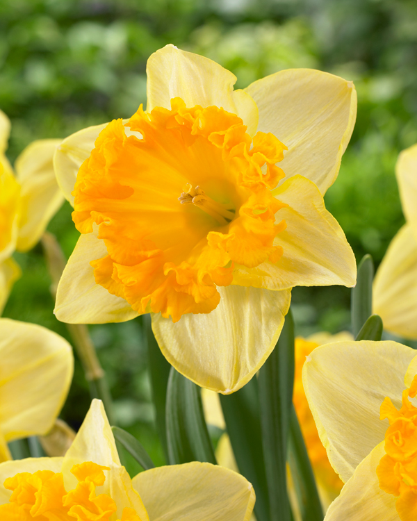 Eine ganz neue Narzissensorte mit extrem großen Blüten, denen sie ihren Namen 'Ferris Wheel' (großes Rad) verdankt. Die Trompete, die einen orangefarbenen Rand hat, ist an der Basis gelb.