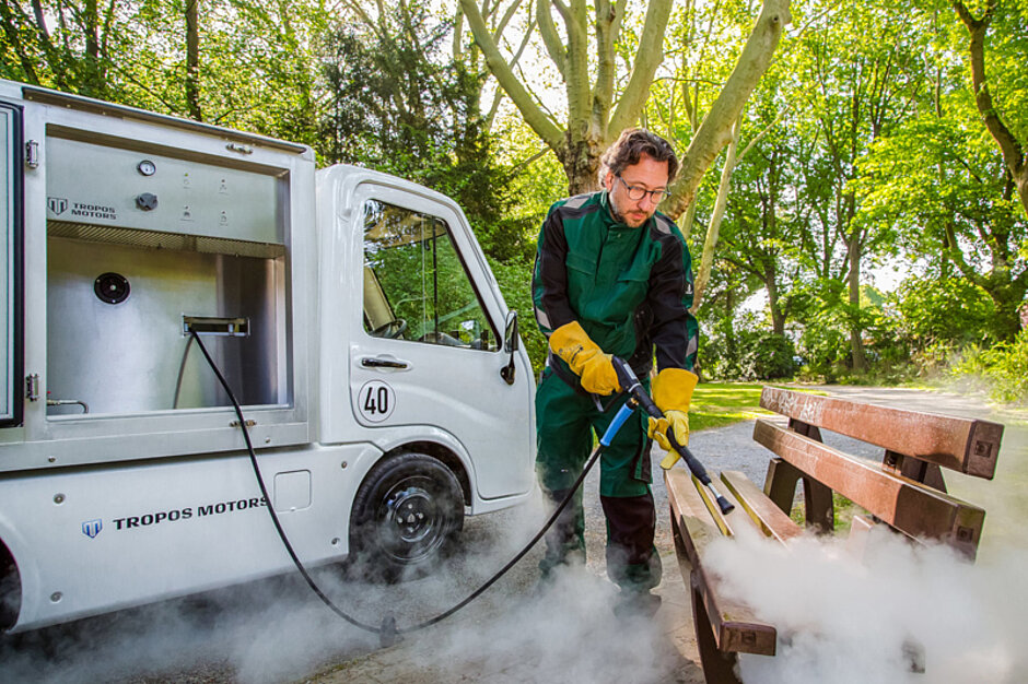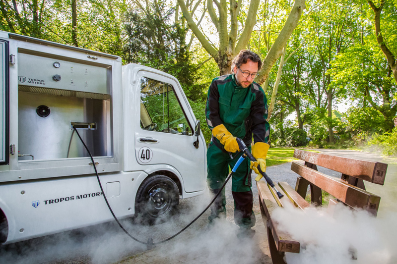 Gleich mehrere Neuheiten stellt TROPOS MOTORS EUROPE im Juli für seine Tropos ABLE Elektrotransporter vor. Darunter ist auch ein Flächenreinigungs- und Desinfektionsaufbau zur Inaktivierung von Viren, Bakterien und Pilzen mittels Trockendampf und ohne Zusatz von Chemikalien. Dies kann in Außenbereichen und im öffentlichen Raum sinnvoll sein – überall dort, wo Oberflächen häufigem Kontakt ausgesetzt sind. Mit der installierten Dampf-Technologie im Desinfektionsaufbau des Tropos ABLE wird Trockendampf erzeugt, der auf allen Oberflächen eingesetzt werden kann und nur eine sehr geringe Feuchtigkeit aufbringt. Hoher Druck verbunden mit thermischer Energie garantiert dabei eine effektive Reinigung und desinfizierende Wirkung für Kontaktflächen und Gegenstände. Zusätzliche Desinfektionsmittel werden nicht benötigt. Die Austrittstemperatur des Trockendampfs an der Lanzenspitze beträgt 135°C. Laut WHO inaktiviert Hitze ab 56°C auch das SARS-Coronavirus. Innerhalb weniger Minuten kommt es bei 55-70°C zur Denaturierung der Virushüllen.