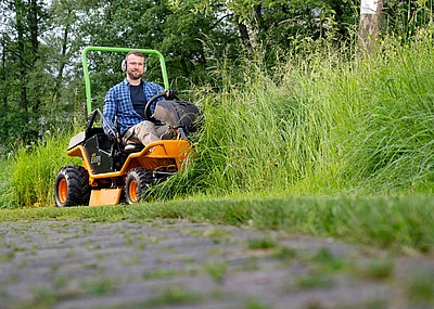 Mit dem Mulch-Kit entfällt der Seitenauswurf. Die Leitbleche halten das Schnittgut länger im Mähdeck und die speziellen Messer zerkleinern es in feine Partikel. Mit der optional erhältlichen Anhängerkupplung kann der Ikon auch einen praktischen Garten-Anhänger ziehen. Wenn der Mäher viel im Freien steht, schützt ihn eine Abdeckhaube vor Schmutz und Nässe. Der neue Ikon ist ab der Mähsaison 2025 erhältlich.