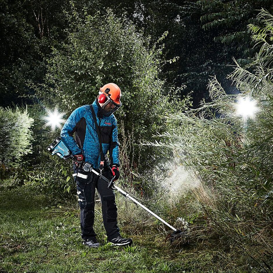 Der komfortable Rundumgriff ist höhenverstellbar, um für die verschiedenen Arbeiten eine ergonomisch ideale Arbeitshaltung zu ermöglichen. Der serienmäßige Schultergurt erleichtert das Tragen. Neben der hohen Funktionalität und der ergonomischen Handhabung überzeugt der Makita Akku-Multifunktionsantrieb mit einem starken Motor und einer elektronischen Regelung beim Anlauf, der Drehzahl und der Drehrichtungsumkehr.