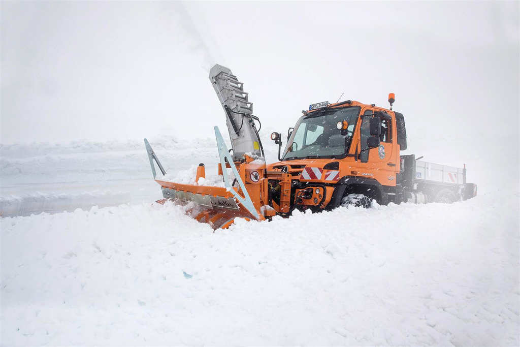 Kombiniert mit der Schneefräse SF 90-100 des schweizerischen Herstellers Zaugg ermöglichte der Unimog Geräteträger – so die Bezeichnung der Baureihe für kommunale Einsätze – den planmäßigen Durchstich auf der Passstraße am 29. April. Für die Schneeräumung mit einer Fräse notwendige, extrem niedrige Arbeitsgeschwindigkeit ist der Profi-Geräteträger mit „hydrostatischem Antrieb“ ausgestattet. Er überträgt die Leistung mittels eines stufenlos regelbaren Hydrauliksystems. Außerdem hat der Unimog am Heck einen schwenkbaren Ballast, um das hohe Gewicht der Fräse von 1,8 t auszugleichen. So ausgerüstet arbeitete sich das kompakte Kraftpaket durch meterhohe Eis- und Schneeschichten nach oben. Am „Hochtor“, dem Punkt des Durchstichs, galt es, eine drei Meter hohe Schneeschicht zu beseitigen, und das bei wildem Schneegestöber. Die Schneewände entlang der knapp 48 km langen Strecke sind bis zu acht Meter hoch.