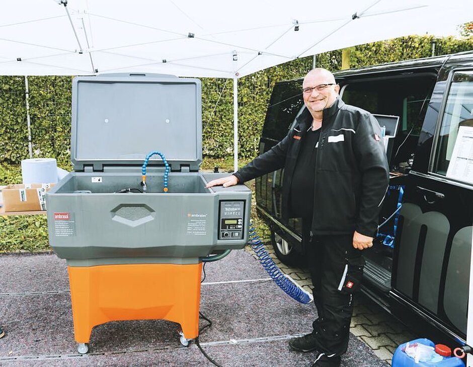 Das Mainzer Spezialchemie-Unternehmen ambratec präsentiert mit dem BTR 3 eine Weiterentwicklung seines Biologischen Teilereinigers. Mit dem neuen ergonomischem Design sowie den verbesserten technischen Eigenschaften – wie etwa der auswaschbare und damit wiederverwendbare Nylonfilter, ein größeres Einweichbecken (optional mit Lufteinblasung/Druckluft-Sprudeleinheit), abgerundeten Ecken (die Schmutzansammlungen verhindern) oder die Möglichkeit, Öl abzulassen, mit einer vormontierte Ölabschöpfung – wird das Gerät zu einem wichtigen Helfer in Werkstätten.