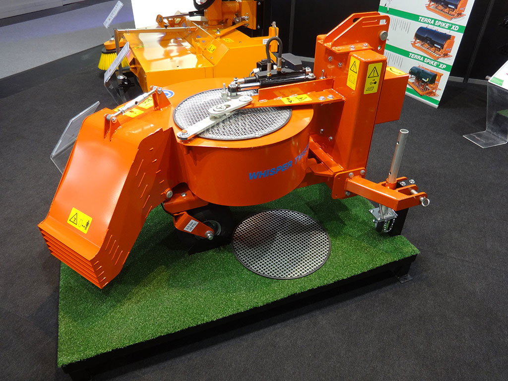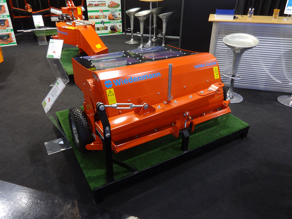 Für die Übergangszeiten hat Wiedenmann den kraftvollen Laubbläser Whisper Twister gezeigt, der durch seine „Flüsterturbine“ vergleichsweise leise ist. Das Laubgebläse ist stufenlos um 180° schwenkbar. Somit kann das Laub kontinuierlich ohne Rückwärtsfahrten und Wendemanöver immer in eine Richtung geblasen werden. Die Luftleistung von 200 m³/min sorgt für ein sauberes Resultat. Mit der Terra Clean 100 zeigten die Schwaben schließlich noch eine neue Maschine zur Reinigung von Kunstrasenplätzen. Den Schmutz nimmt sie über eine Kehrwalze mit vier Bürstenleisten auf. Ein Rüttelsieb mit Lochblech separiert das wertvolle Füllmaterial, um es sogleich wieder auf den Rasenflor auszustreuen. Der aufgenommene Schmutz und Unrat wird in einem Behälter mit 50 Litern Fassungsvermögen gesammelt. Durch den beidseitigen Einzelradantrieb kann der Hersteller eine gleichmäßige Kehr- und Siebleistung mit 1200 mm Arbeitsbreite auch bei engen Kurvenfahrten gewährleisten.