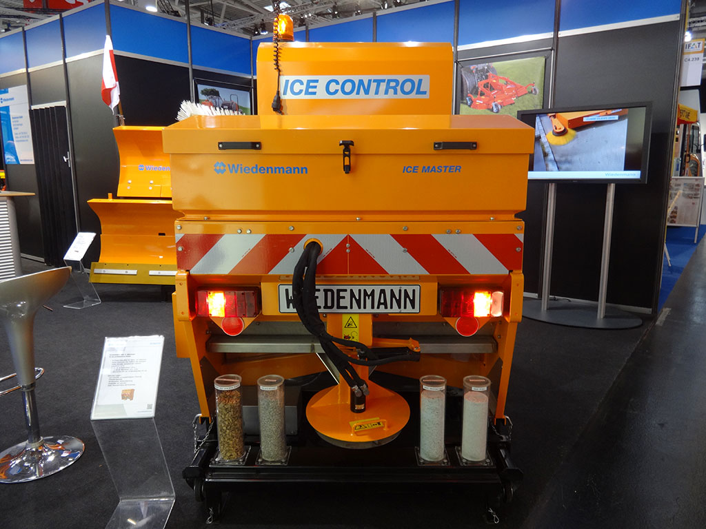 Ideal ergänzt wird das Schild durch den gezeigten Kombi-Streuer Ice Master in neuester Version. Der Streuer kann durch eine elektronische Steuereinheit namens Ice Control erweitert werden. Die Ausbringungsmenge pro Quadratmeter wird dann konstant gehalten - egal, wie schnell sich das Fahrzeug bewegt. Der Streuer beherrscht sowohl Kasten- als auch Tellerstreuen bis sechs Metern Streubreite. Im 250 Liter fassenden Behälter sorgt eine Dosierwelle für ein gleichmäßiges Streuergebnis.