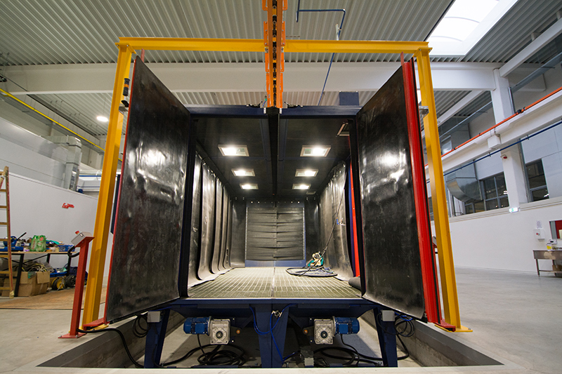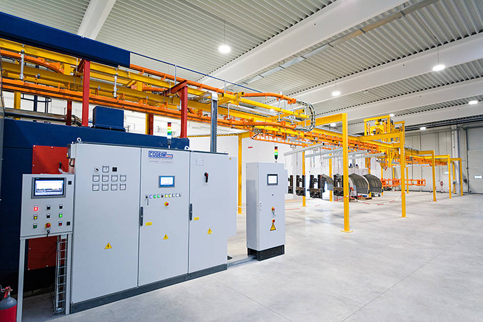 Die neue Maschine, die Ende vergangenen Jahres installiert wurde, ist nach Unternehmensaussagen eine der größten und modernsten für Oberflächenschutz in Europa. Sie besteht aus einer 180 Meter langen Produkttransportlinie, einer Lackierkammer und einer automatischen Strahlkammer. Sie ist 15 Meter breit und 5,50 Meter hoch und ist für die Oberflächenbehandlung von Produktteilen wie Einzelpflugscharen, Auslegermäherarmteilen, Streuer-, LYNX- und Kehrmaschineteilen vorgesehen. Obwohl die Installation der neuen Linie den Oberflächenschutzprozess größtenteils automatisiert hat, wird ein Großteil der Lackierung aufgrund der verschiedenen Teile der Geräte, die geschützt werden müssen, immer noch von Hand ausgeführt.