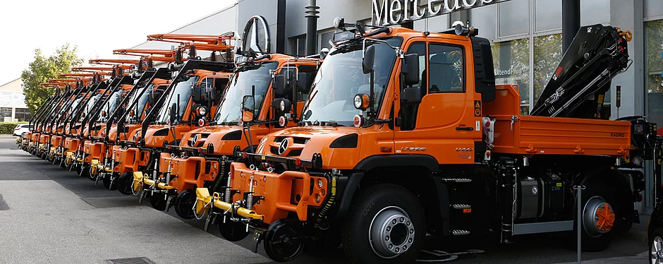 Der Mercedes-Benz Unimog bietet auch im 2-Wege-Einsatz alle relevanten Ausstattungen, die ihn als professionellen Geräteträger auf der Straße auszeichnen, bereits ab Werk. Dazu gehört unter anderem der hydrostatische Fahrantrieb (EasyDrive), der in diesem Fall für das Arbeiten mit dem Schienenschleifgerät oder dem Mähausleger genutzt wird und eine fein dosierbare variable Arbeitsgeschwindigkeit bei konstanter Motordrehzahl ermöglicht. Beim Betrieb mit dem Schienenschleifgerät kann der Unimog über eine Fernsteuerung des hydrostatischen Fahrantriebs auch von außerhalb der Kabine gefahren werden. Desweiteren sind die Unimog mit einer mechanischen Frontzapfwelle für den Antrieb der Schneefräse, einer leistungsfähigen Arbeitshydraulik mit 2 Kreisen sowie vielfältigen mechanischen und elektronischen Schnittstellen ausgestattet.