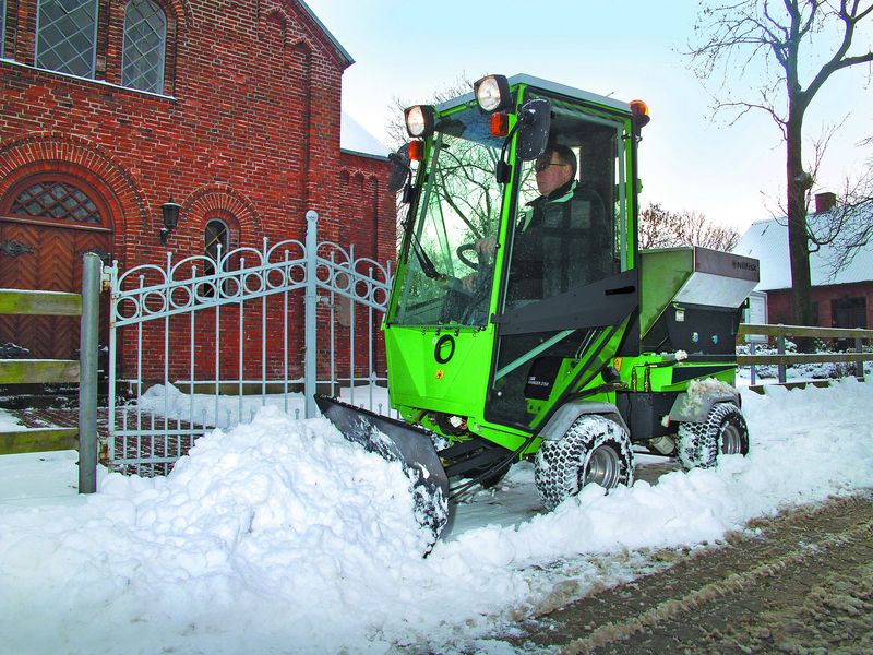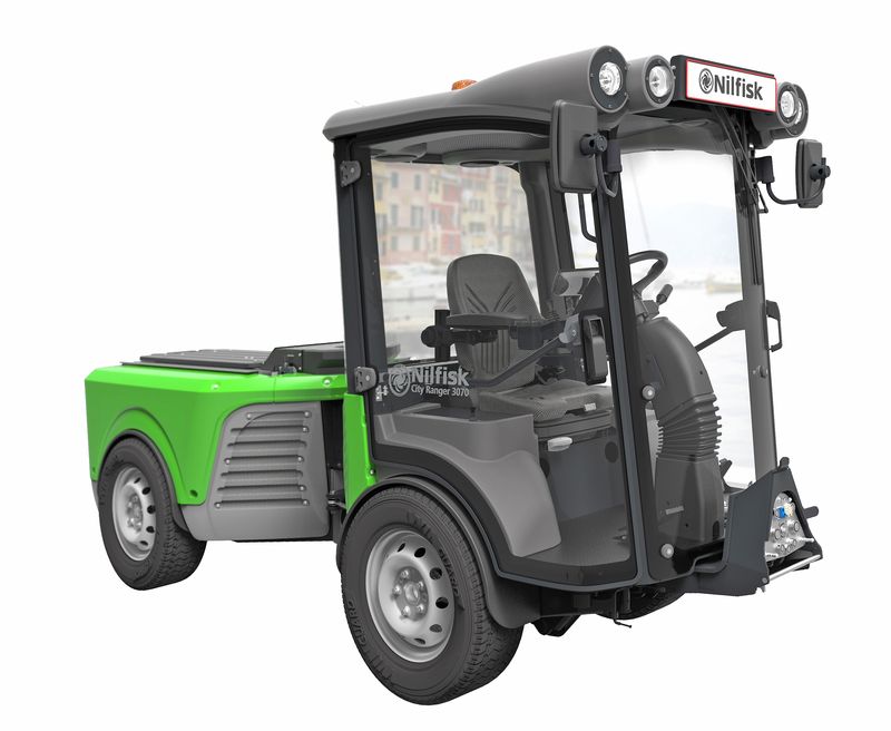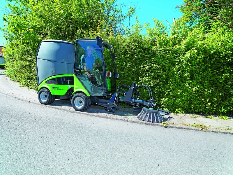Der City Ranger 3070 setzt mit seinem neuartigen technischen Konzept neue Maßstäbe innerhalb der Reinigungsbranche: eine Kombination aus 360-Grad-Panoramasicht, flexibler Wendigkeit, Leistungsfähigkeit (67 PS/50kW), Abgasnorm Stufe IIIB und dennoch kompakten Maßen (368,5 x 122,1 x 200 cm/L x B X H). Dank des inneren Wenderadius von 825 Millimetern, der Knicklenkung und verschiedensten Anbaugeräten für Winterdienst, Grünflächenpflege und Kehrarbeiten wird die Reinigung und Pflege von beengten Flächen zum Kinderspiel. Für den einfachen und rückenschonenden Austausch – zum Beispiel von Kehr- auf Winterdiensttechnik – verfügt der City Ranger 3070 über ein neuartiges Schnellwechselsystem. Das Kupplungssystem ist so einfach zu bedienen, dass sich ein Anbaugerät in weniger als einer Minute auswechseln lässt. Der Anschluss der Hydraulik-, Wasser- und Elektroanschlüsse erfolgt automatisch. Außerdem neu ist das zum Patent angemeldete Motorkühlkonzept: Es verringert den Geräuschpegel erheblich (Fahrerkabine: 69 db(A)) und verdoppelt gleichzeitig die Kühlwirkung auf den Motor – auch bei hohen Umgebungstemperaturen. Last but not least garantieren das geringe Gewicht (1.710 kg) und der Eco-Mode einen reduzierten Kraftstoffverbrauch, weshalb sich der City Ranger 3070 ideal für den Einsatz in Innenstädten und auf empfindlichen Grünanlagen eignet. Trotz dieser Leichtbauweise ist der City Ranger 3070 dank seines technischen Konzepts auch eine ideale Maschine für den Winterdienst.