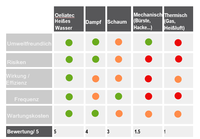 Die Technologie ermöglicht es, dreifach auf die Pflanze einzuwirken: Mikrotröpfchen aus kochendem Wasser greifen die Blätter an und sprengen die Zellen auf, wodurch ein Hitzeschock entsteht, der dann den Wurzelhals bis zum Kern verbrennt und schließlich das Wurzelsystem sowie die Wurzeln selbst zerstört. Dadurch wird die Pflanze nicht nur an der Oberfläche, sondern auch im Inneren vernichtet. Zur Beseitigung von Unkraut gibt es verschiedene Möglichkeiten. Sie unterscheiden sich in Bezug auf ihre Umweltauswirkungen, ihre Nachhaltigkeit und ihren Wirkungsgrad.