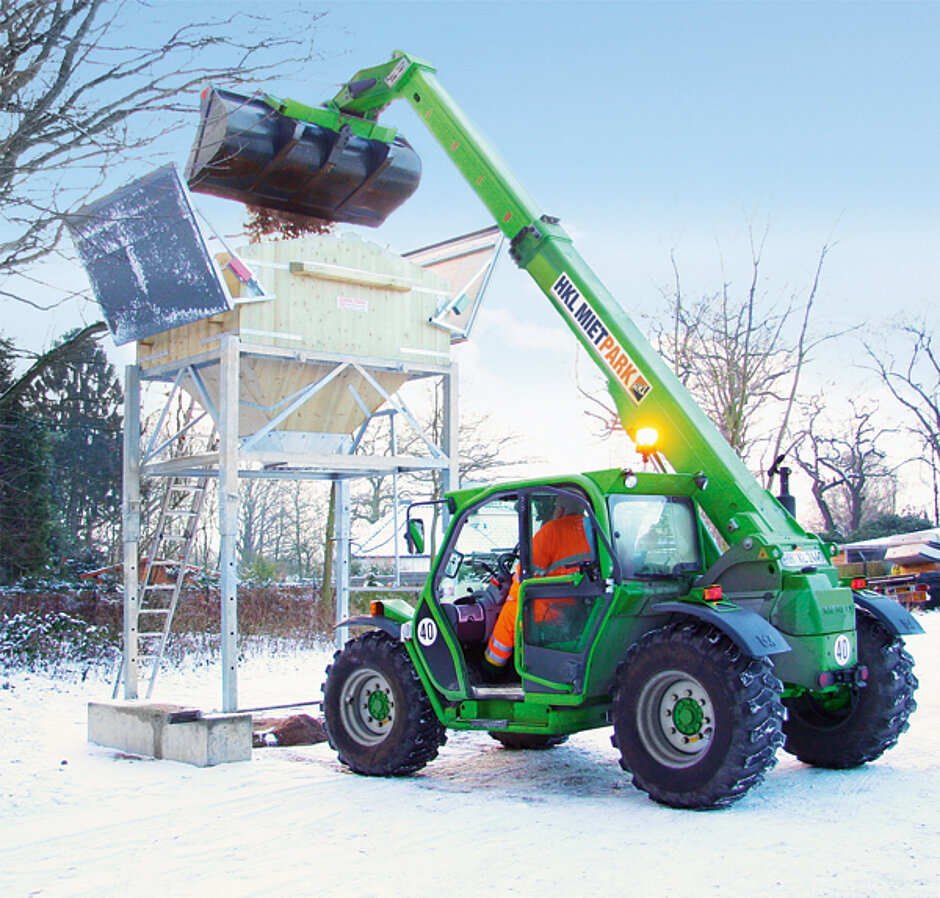 Ist der Schnee erst da, kommen Maschinen aus dem HKL MIETPARK zum Einsatz und übernehmen anstehende Winterdienstaufgaben. Leistungsstarke Teleskopmaschinen werden zum Beispiel als Streugutbestücker eingesetzt. Ihre Ausleger sind bis zu 13 Meter ausfahrbar. Damit können sie Streufahrzeuge und -behälter einfach und schnell befüllen. Radlader von HKL ausgestattet mit Schneeschild oder Streuer sind optimal für Schneeräumarbeiten geeignet und gewährleisten schnelles und kosteneffizientes Arbeiten.