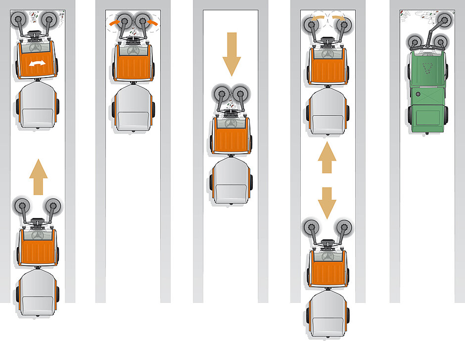 Dank der Holder-Knicklenkung und der einzeln steuerbaren Besen der Easy Clean Kehrsaug-Kombination kehrt der Holder C 270 schmale Kurven, Ecken, Parklücken, Gehwege oder enge Gassen gründlich und bis zur Wand rückstandsfrei – effizienter und präziser, als es mit 3 Besen möglich wäre. Da mit 2 Besen zudem weniger Material verbraucht wird, weist der C 270 bis zu 33 % weniger Verschleiß auf.