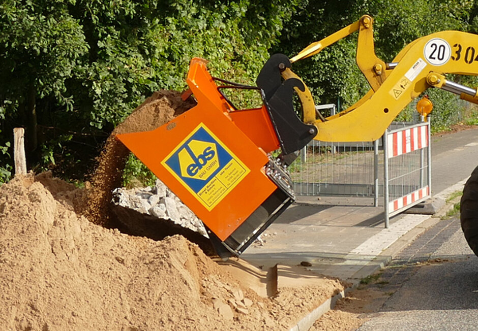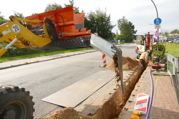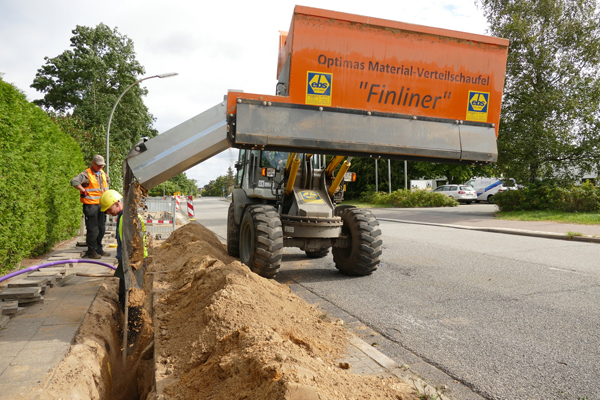 In Neumünster verlegt die EBS GmbH etwa 40 km Glasfaserkabel für schnelles Internet. Mit im Einsatz ist der Optimas „Finliner“, ein Anbaugerät. Der „Finliner“ ist eine Material-Verteil-Schaufel. Sie wird hydraulisch betrieben und an einen Radlader angebaut. Das geht per Schnellwechlser sehr flott. Ist der „Finliner“ montiert, kann er um 90° nach vorn geschwenkt werden. Dann nimmt man zum Beispiel Verfüllsand auf. Bis zu 1 m³ fasst das Gerät. Nun wird zu dem zu verfüllenden Graben gefahren. Parallel zu ihm fährt der Radlader und der Sand wird per Förderband kontinuierlich, exakt dosiert und flächengenau verteilt.