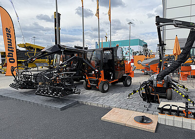 Pflastern konnten die Schüler mit der PaveJet S 24 Pflasterverlegemaschine. Sie hat einen ölgekühlten Kubota-Motor mit 25 PS bei 2.300 U/min. Durch den schallgedämmten Motor kann die Maschine problemlos in Umweltzonen arbeiten. Über das Sieben-Zoll-Display können Anwender die drei Fahrmodi (Basis, Standard, Spezial) einstellen. Auch der hydraulische Druck der Greifer ist einstellbar, was Kraftstoff spart und das Material schont. Fehler im System werden sofort angezeigt und zugeordnet. Durch eine optionale Rückfahrkamera wird zudem mehr Sicherheit gewährleistet. Mit 1.980 mm Höhe ist auch ein Betrieb in Tiefgaragen möglich.