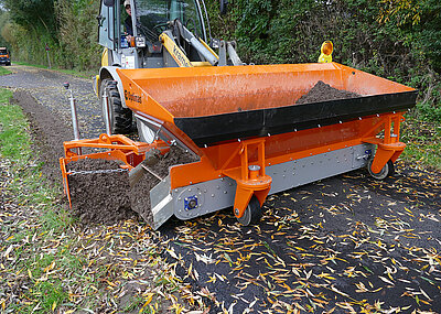 Die Einsatzgebiete sind vielfältig: Verteilung von Fundament- und Rückenstützbeton beim Bau von Randeinfassungen; Verteilung von Mutterboden im geplanten Grünstreifen; Absanden von Gräben und Leitungen; Verteilung von Asphalt bei Reparaturarbeiten; Absanden von Drainagegräben; Verteilung von Schotter/Splitt im Bankettbau; Verteilung von Streusalz in Salzbehälter; Verteilung von Hackschnitzeln in Pflanzstreifen. Im Hochwasserschutz ist die Befüllung von Sandschläuchen oder Sandsäcken möglich. Sand, Kies und Beton sind verwendbar. Für den Asphalteinbau gibt es ein spezielles Laufband.