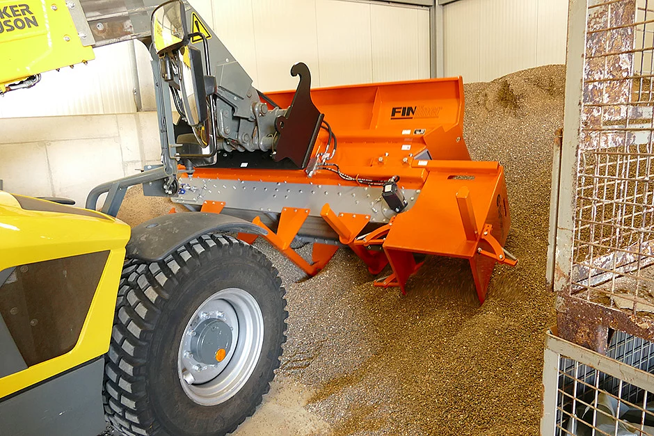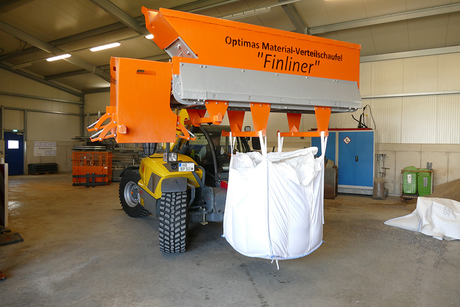 Angebaut an einen Radlader ist die Finliner wie eine Ladeschaufel nutzbar. Die große Schaufel hat eine Einfüllbreite von 2,60 Meter und ein Fassungsvermögen von mindestens einem Kubikmeter. Über ein Förderband von 2,50 Meter Länge wird das Schüttgut schnell in den seitlich angehängten Big Bag befördert. Material aufnehmen und einfüllen dauert etwa eine Minute. Dann kann der Behälter sofort eingesetzt werden. „Durch die Finliner sparen wir beim Befüllen und Verteilen viel Personal, das nun in diesen kritischen Zeiten anderweitig unterstützt“, so von Deetzen. Ebenfalls kann die Verteilschaufel direkt vom Lkw aus befüllt werden.