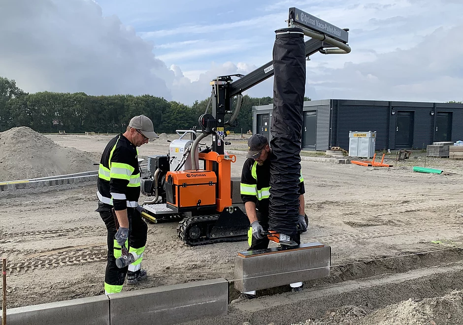 Im Vacu-Pallet-Mobil ist die Vakuum-Schlauchhebetechnik mit einem Fahrwerk mit zwei Gummiketten kombiniert. Zwischen den Ketten befindet sich eine Palettengabel, mithilfe derer die zu verlegenden, auf Paletten gestapelten Bordsteine (oder Absenker, Platten, Rinnsteine usw.) transportiert werden können. Anwender haben das Material also immer direkt an der Einbaustelle. Dadurch, dass das Fahrwerk mit Gummiketten ausgerüstet ist, ist der Material-Transport auch auf schwierigem Gelände möglich. Der Auslegerarm lässt sich um 360 Grad schwenken und hat einen Arbeitsradius von drei Metern. In diesem Radius kann er bis zu 140 kg heben und bewegen – in einem eingeschränkten Radius bis zu 200 kg. Er ist knickbar, sodass auch entlang an Wänden, Buschreihen oder sozusagen um die Ecke gearbeitet werden kann.