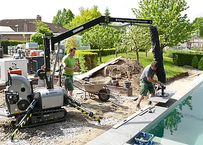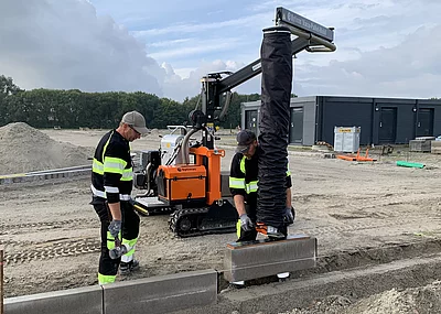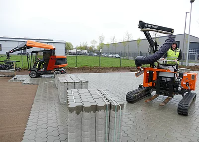 Mit einer Bau-Höhe von knapp zwei Metern können Kunden jetzt auch in Tiefgaragen arbeiten. Einfahrt, Ausfahrt und Betrieb sind damit möglich, ohne die Maschine demontieren zu müssen. Die Zwei-Achs-Drehschemel-Lenkung in Verbindung mit dem Endlos-Greifer-Drehgetriebe machen die PaveJet S24 zu einer beweglichen und flexibel nutzbaren Pflasterverlegemaschine. Auch das Abgreifen von Steinlagen aus 2,60 Meter Höhe sind damit problemlos möglich.