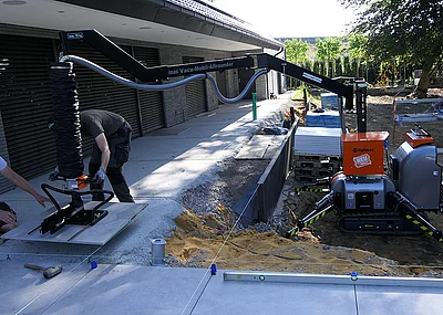 Wer beim Verlegen leistungsfähig bleiben will, nutzt die Optimas-Vakuum-Technik. Zum Beispiel das Vacu-Pallet-Mobil: Es führt das Verlegematerial auf zwei Kettenlaufwerken mit sich. Mit der Ansaugplatte, die am Drei-Meter-Ausleger montiert ist, wird die Platte, der Bordstein, die Leitplanke usw. aufgenommen. Bei bis zu 150 kg liegt die Tragfähigkeit des Auslegers. Mit zwei Fingern kann man mit seiner Hilfe die schweren Lasten bewegen. Bis zu drei Meter weit reicht der knickbare Auslegearm, der um 360 Grad geschwenkt werden kann. Dies entlastet den Körper gewaltig und erhält so die Arbeitskraft fürs Leben.