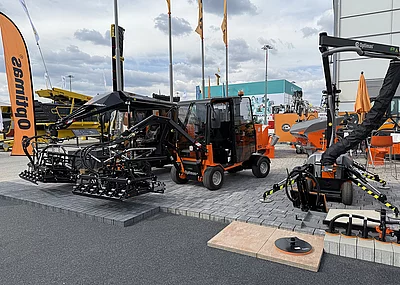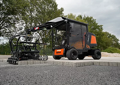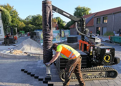 Der Vacu-Mobil-Allrounder (VMA) verfügt über zwei Kettenlaufwerke und wird von einem 14 PS starken Benzinmotor angetrieben. Mit einer Breite von nur 920 mm passt er selbst durch schmale Lücken oder Durchfahrten. Gerade bei kleinen oder räumlich stark begrenzten Baustellen sowie in Straßenverkehrssituationen schafft diese Schmalheit wichtige Bewegungsmöglichkeiten und zusätzliche Sicherheit. Für einen sicheren Stand beim Verlegen sorgen vier hydraulisch steuerbare Abstützfüße. Zudem verfügt der knickbare Auslegerarm in der Standardausführung über eine Reichweite von drei Meter bei einem Schwenkbereich von 360 Grad. Dabei können bis zu 140 kg schwere Lasten bewegt werden. Auf der angesprochenen Baustelle ist der VMA zudem mit einer optionalen Verlängerung ausgestattet und erreicht dadurch eine Reichweite von 3,90 Meter.