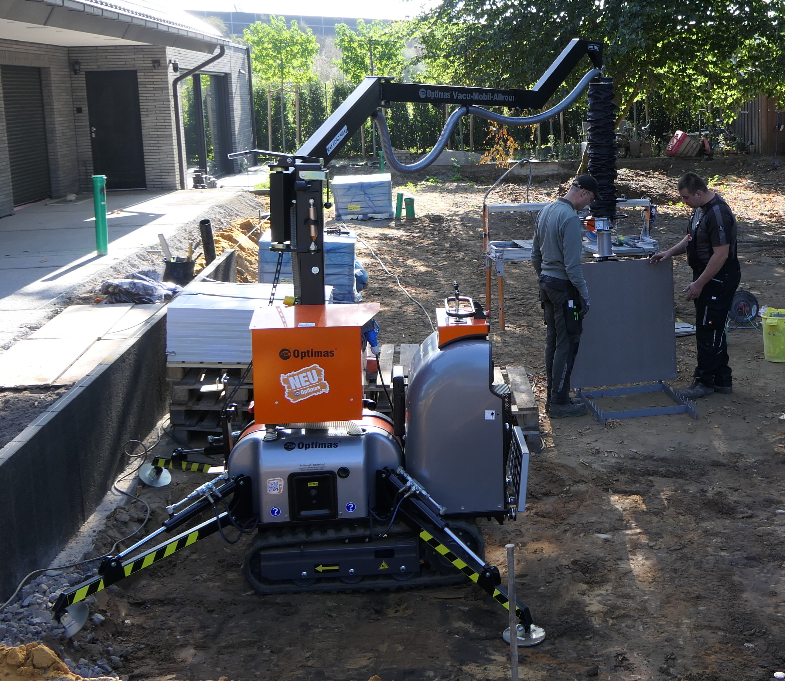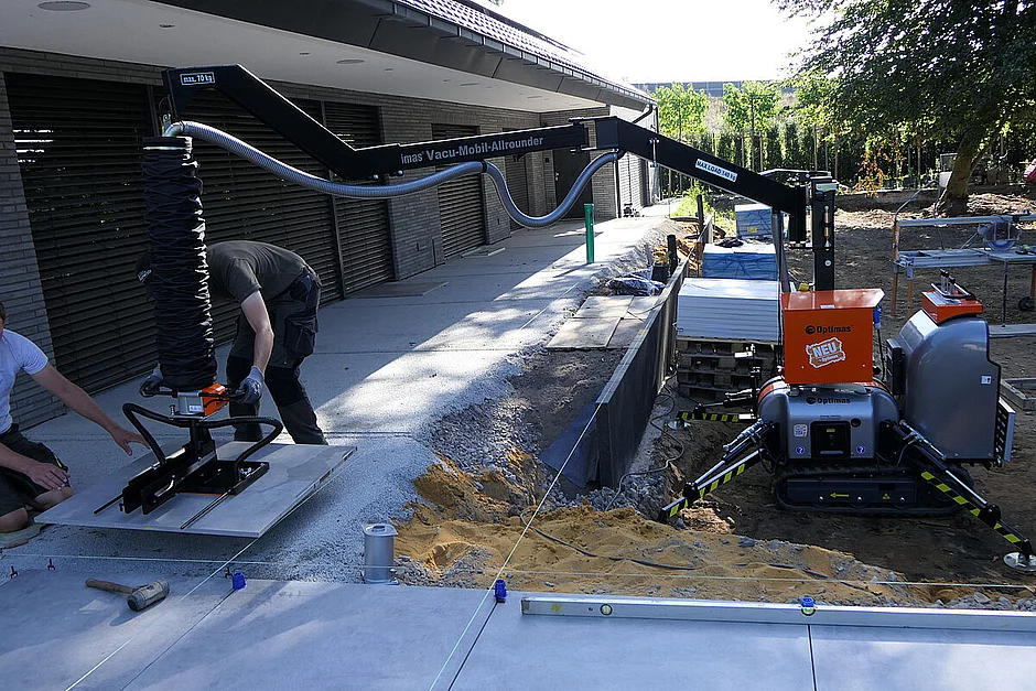 „Körperschonend zu arbeiten ist ein wichtiger Leitgedanke für uns. Mit dem Vacu-Mobil-Allrounder können wir das verwirklichen“, sagt Uli Baumeister, Geschäftsführer der Baumeister GaLaBau GmbH aus Raesfeld im Münsterland. Bei einer sehr umfangreichen Gartengestaltung in Borken verlegt Baumeister zurzeit italienische Keramikfliesen (ein Meter auf ein Meter auf zwei cm). Da muss vorsichtig gearbeitet werden, denn die Fliesen haben insgesamt einen sechsstelligen Wert. Eine Platte wiegt 45 kg plus Kleber und muss über mehrere Meter bewegt werden. Bei solchen Aufgaben zeigt der VMA von Optimas seine Stärken.
