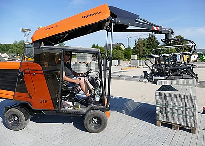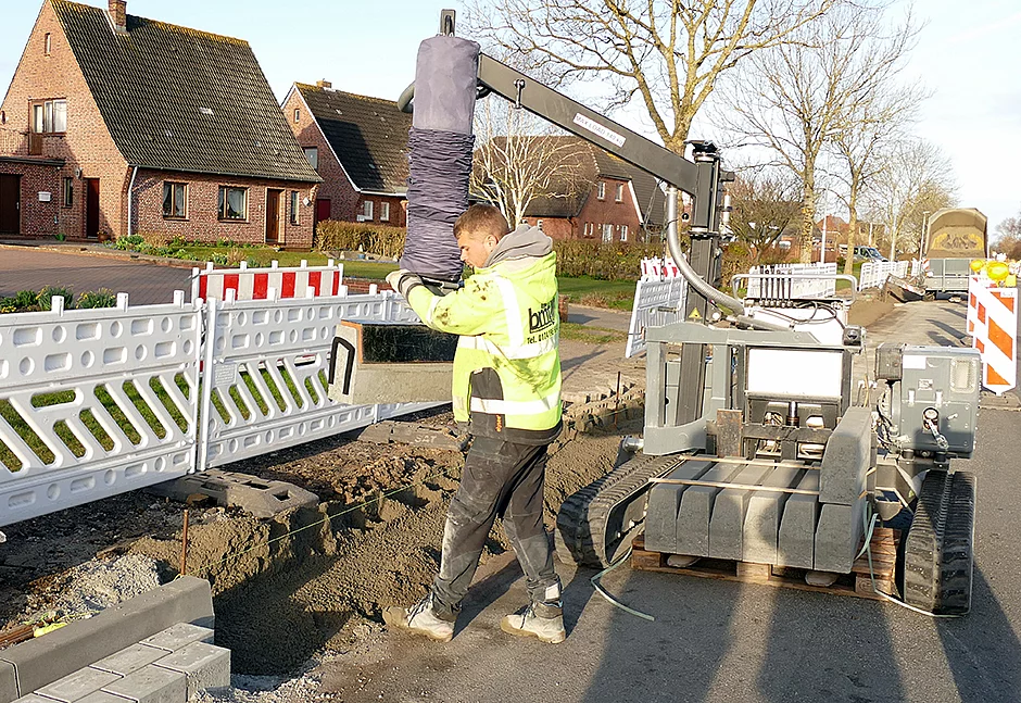 „Unsere Mitarbeiter sollen über viele Jahre oder Jahrzehnte gesund bei uns arbeiten können. Deshalb haben wir das Optimas Vacu-Pallet-Mobil im Einsatz. Verlegearbeiten sind mit ihm ohne Kraftaufwand möglich“, sagt Thade Jensen, Geschäftsführer der Bauen mit Tiefsinn GmbH aus Struckum in Nordfriesland. Mit dem Vacu-Pallet-Mobil wird Materialtransport (Pflastersteine, Platten oder Bordsteine etc.) mit Materialhandling verbunden. Das einzubauende Material muss daher nicht entlang der Strecke positioniert werden.