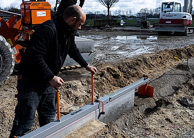 Zum Einsatz kann der Mast innerhalb kürzester Zeit aufgestellt werden. Während der Arbeit wird er schnell hydraulisch ausbalanciert. Dies ist von besonderer Bedeutung, wenn schwere Betonelemente zum Beispiel in abfallendem Gelände verlegt werden. Optional ist das Ausbalancieren auch automatisch möglich.