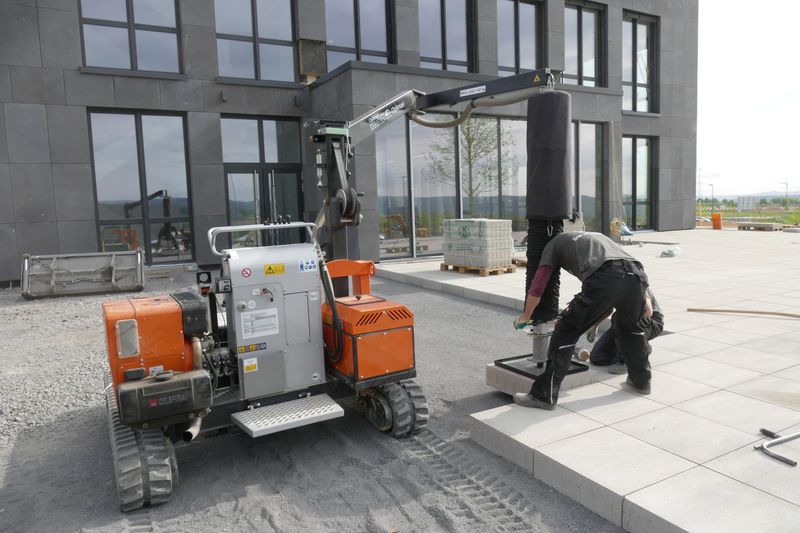 Als wäre die Betonplatte mit ihren 140 kg federleicht, hebt der Mitarbeiter sie mit dem Vakuum-Schlauchheber von der Palette und baut sie in die Pflasterung ein. Dass Schwergewichte dieser Art so einfach, fast mit dem kleinen Finger, zu handhaben sind, muss man erlebt haben. Im Einsatz ist das Optimas Vacu-Pallet-Mobil. Es verbindet den Materialtransport (Pflastersteine, Platten oder Bordsteine etc.) mit dem Materialhandling. Somit muss das einzubauende Material nicht entlang der Strecke positioniert werden. Man hat es dabei. Im Optimas Vacu-Pallet-Mobil ist die Vakuum-Schlauchhebe-technik mit einem Fahrwerk mit zwei Gummiketten kombiniert. Zwischen den Ketten befindet sich eine Palettengabel, mithilfe derer die zu verlegenden, auf Paletten gestapelten Platten, Bordsteine usw. transportiert werden können.