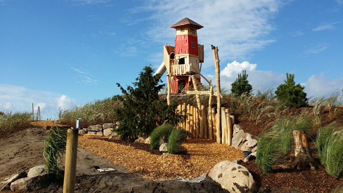 Der acht Meter hohe Leuchtturm „Langer Robert“ wird ein strahlendes Lächeln in die Gesichter der Kinder zaubern. Der rot und weiß gestreifte Spielturm ist über eine Wendeltreppe begehbar. Wieder hinab gelangt man am besten über die Röhrenrutsche aus Edelstahl.