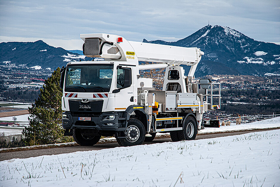 Zudem kommt eine extreme Geländegängigkeit. Die P 370 KS auf dem neuen MAN 18.290 TG3 eignet sich nicht nur wegen des Allradantriebs für den Einsatz in unwegsamen Gelände, sondern auch wegen des hydraulisch einziehbaren Unterfahrschutzes, welcher für einen extremen Böschungswinkel sorgt und direkt von der Fahrerkabine aus bedient wird. Das Display im Fahrerhaus gibt Auskunft über den Betriebszustand der Hubarbeitsbühne, und das Premium-Korbsteuerpult erleichtert die Bedienung durch eine Vielzahl an Assistenzfunktionen. PALFINGER wird Mair auch in Zukunft mit seinem Serviceteam betreuen. Denn jede Maschine sollte entsprechend gewartet werden, um die volle Leistungsfähigkeit und Lebensdauer zu gewährleisten.