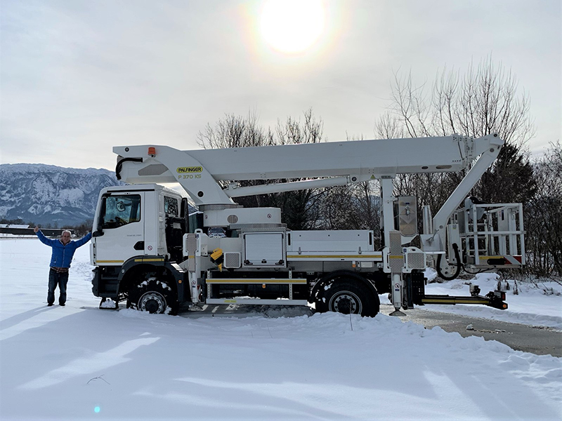 Ende Januar ist die P 370 KS auf einen MAN 4x4 der Firma Mair in Maurach,Tirol, übergeben worden. Der treue PALFINGER-Kunde und Firmeninhaber, Alex Mair, setzt ausschließlich auf die Kurbelschwenktisch-Baureihe des Kranspezialisten. Laut Aussagen des Herstellers sei Mair von der Maschine „hin und weg“. Er sei sogar am Tag des Fotoshootings extra von Tirol angereist, um die P 370 KS noch vor der Übergabe zu besichtigen. Nicht schlecht gestaunt habe er, als er das Komplettfahrzeug am Ulrichshögl in Ainring in Szene sah. „Ich bin mit der Maschine überglücklich. Für meinen Malerbetrieb bedeutet das eine wesentliche Arbeitserleichterung. Durch die enorme Reichweite muss das Fahrzeug nicht so oft umgestellt werden, und mit dem Allradantrieb kommt man überall hin“, so Mair.
