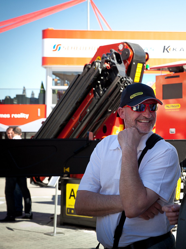 Auf dem PALFINGER Stand trifft sich die ganze Welt. Vom Bauunternehmer, Einkäufer, Techniker, Baumaschinenfreak bis zum eingefleischten Ladekranfahrer. Einer davon ist Horst Gruber, seines Zeichens Kranfahrer aus Leidenschaft – wohl bemerkt „PALFINGER Kranfahrer“ aus Leidenschaft. Seit 9 Jahren bei der Firma Meister aus Dieburg bei Darmstadt als Großkranfahrer beschäftigt und seit 6 Jahren für PALFINGER in Sachen Vorführungen in ganz Deutschland unterwegs gehört er sozusagen zur Familie. Vorführungen mit dem neuen PK 200002 L SH sowie die Bedienung anderer PALFINGER Produkte gehören während der Bauma zu seinen Aufgaben.