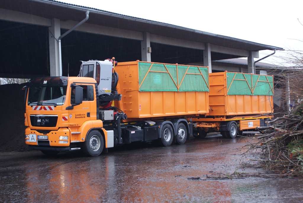 Probleme mit der Lärm- und Geruchsbelästigung für Anwohner an den Wertstoffhöfen im Landkreis sowie wirtschaftliche Überlegungen waren für Heiner Lexa und seine Kollegen von der Landkreismüllabfuhr Rosenheim Anlass für die Ausarbeitung eines neuen Logistikkonzeptes. Seit Mitte des vergangenen Jahres sammelt man das Grüngut mit Hilfe eines Containerfahrzeuges mit EPSILON Recyclingkran und PALFINGER Abrollkipper.