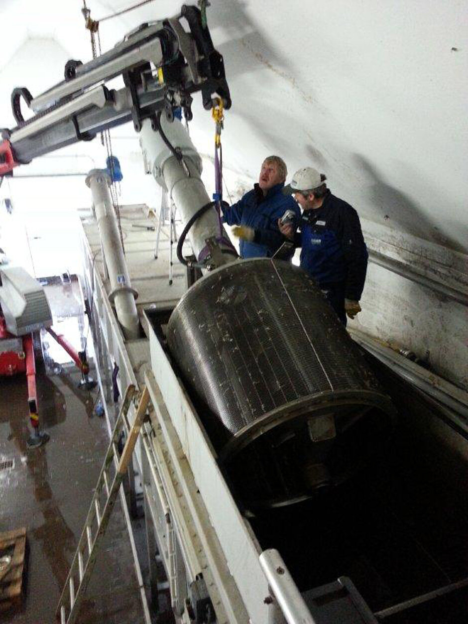 "Der Knickpunkt des Arms liegt bei 4 Metern", erklärt Ralf Blank, "also passge-nau, um den Rechen direkt unterhalb des Hallendaches zu erreichen." Huber-Monteure demontierten den Rotamat-Rechen und verzurrten ihn am Wirbelhaken des SMK. Danach hob Kranführer Blank den Feinstrechen aus der Anlage. "Die Maschine muss mit viel Feingefühl gelenkt werden", macht er deutlich, "beson-ders in so engen Räumen wie dem Klärwerk." Der Kran lässt sich komplett durch Funkfernbedienung steuern. Aber auch das erfordere eine gewisse Erfahrung. Nach der 4-stündigen Wartung fand der Rechen wieder seinen Platz in der Anla-ge. "Mit dem SMK dauerte die komplette Revision nicht mal einen Tag", sagt Klärwärter Behrend begeistert. Sein Fazit: Der flexible Spezialkran sei genau die richtige Lösung für die Gemeinde Habichtswald gewesen.