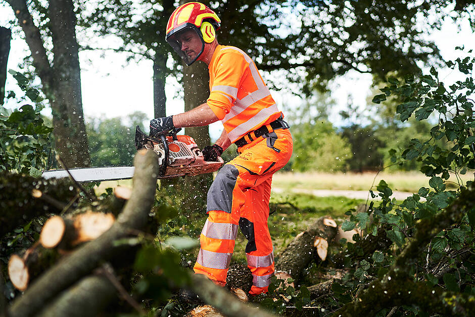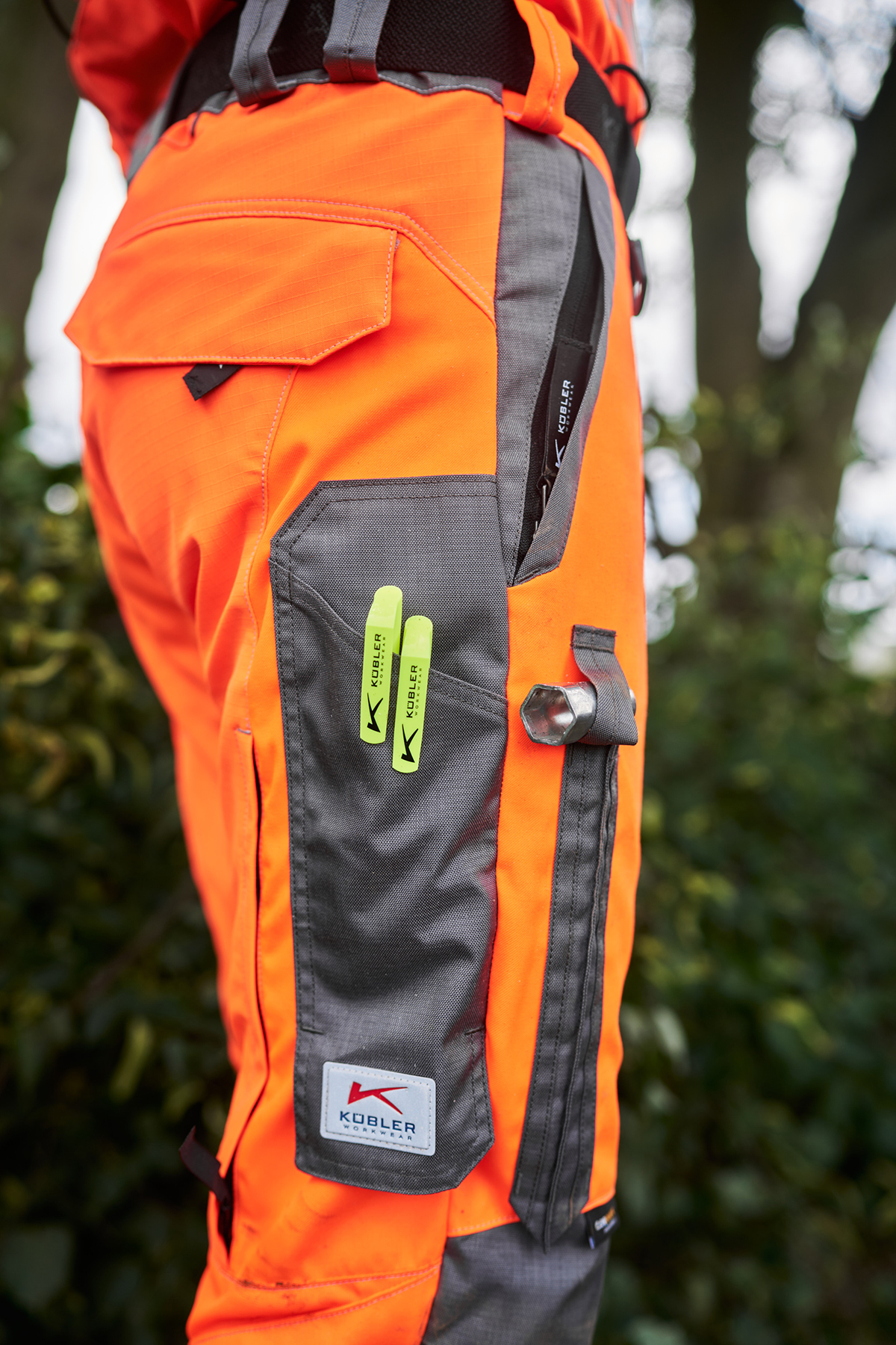 Die neue Kübler Reflectiq-Schnittschutzhose verbindet Schnittschutz mit dem bei Arbeiten in Straßen- und Gleisbereichen geforderten Warnschutz. Zertifiziert nach EN ISO 11393-2, Form A schützt die Hose Träger bei Baumpflege- und Baumfällarbeiten mit handgeführten Kettensägen vor Schnittverletzungen und gewährleistet als hochsichtbare Warnkleidung gemäß EN ISO 20271, Klasse 2, dass diese von allen Seiten auffällig sichtbar und schnell als Menschen erkennbar sind.