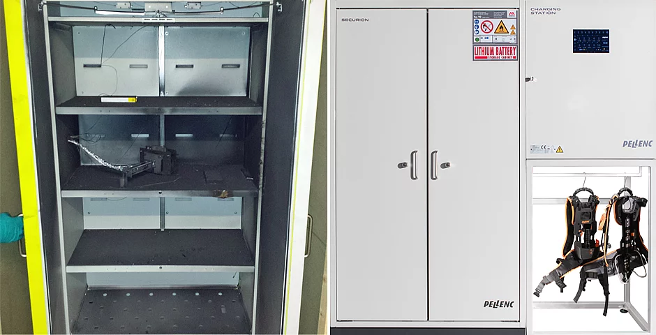 Neben der einfachen Ladung steht bei Pellenc die sichere Lagerung im Fokus. Der Sicherheitsschrank ist vom TÜV nach DIN EN 14770-1 und der EN 1363-1 geprüft sowie nach F90 als hochfeuerhemmend zertifiziert. Als laut eigenen Angaben erster und einziger Anbieter kann Pellenc einen Nachweis erbringen, dass der Sicherheitsschrank Securion auch wirkungsvoll gegen eine Rauchgasexplosion im Schrank schützt. Dieses Gefahrenszenario ist wahrscheinlicher als äußere Brandeinwirkungen.