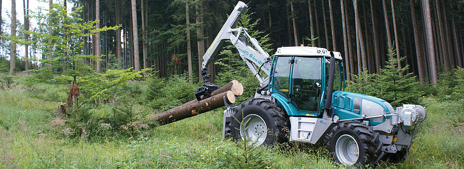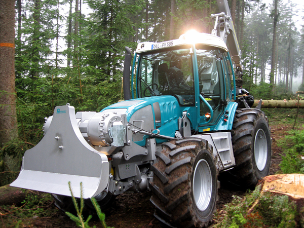 Neben dem bereits vorgestellten Systemschlepper wird nun auch die Forstvariante des Pm Trac III präsentiert. Ist der Systemschlepper ausgelegt für den kombinierten und flexiblen Einsatz in unterschiedlichen Einsatzbereichen, so ist der Forst Trac für den reinen Forsteinsatz konzipiert. Das größte Unterscheidungsmerkmal ist dabei die Position der Seilwinde am Fahrzeug. Um einen schnellen An- und Abbau der Seilwinde zu ermöglichen und damit ein flexibel einzusetzendes Systemfahrzeug zu erhalten wurde die Seilwinde bisher unter dem Kran verbaut. In dieser Position ist es möglich diese zusammen mit dem Kran in wenigen Minuten abzubauen. Wird die Seilwinde nun in der Front des Schleppers angebaut ist dies für die Gewichtsverteilung des Fahrzeuges von großem Vorteil. Auch das Gesamtgewicht des Schleppers reduziert sich, dadurch das Gewicht der Frontwinde das ursprüngliche Frontgewicht nicht mehr benötigt wird. Der Pm Trac wird in der dritten Generation auf einem komplett eigenen Fahrzeugchassis, dessen wesentliche Bauteile aber auf bewährten Großserienteilen beruhen, aufgebaut. „Dies gibt uns die Möglichkeit bereits bei der Grundmaschine auf Komponenten zu setzen, die nachher optimal für die Arbeit als Forstschlepper geeignet sind“, so Paul Pfanzelt, Geschäftsführer der Pfanzelt Maschinenbau GmbH. Bestes Beispiel hierbei ist die neue Vorderachse, die als Schubrohrachse mit hydraulischer Federung und automatischer Verblockung ausgebildet ist. Sobald der Pm Trac steht wird die hydraulische Federung automatisch verblockt. Das Fahrzeug erreicht nun ohne zusätzlichen Bedienaufwand eine Standfestigkeit, wie dies vorher nur bei Forstspezialschleppern erreicht wurde.