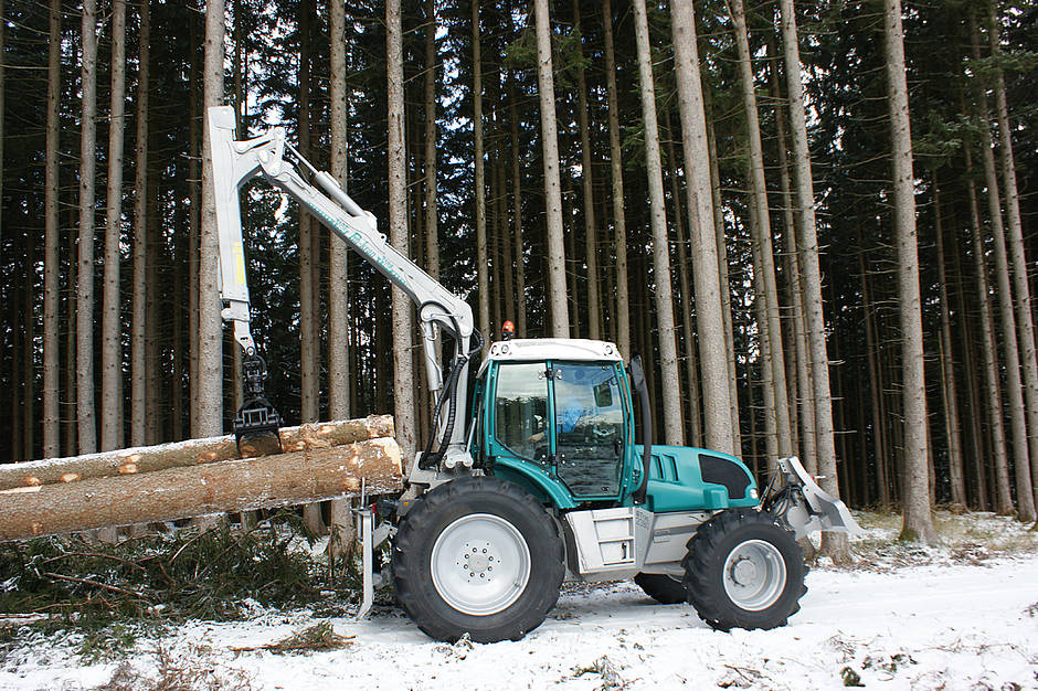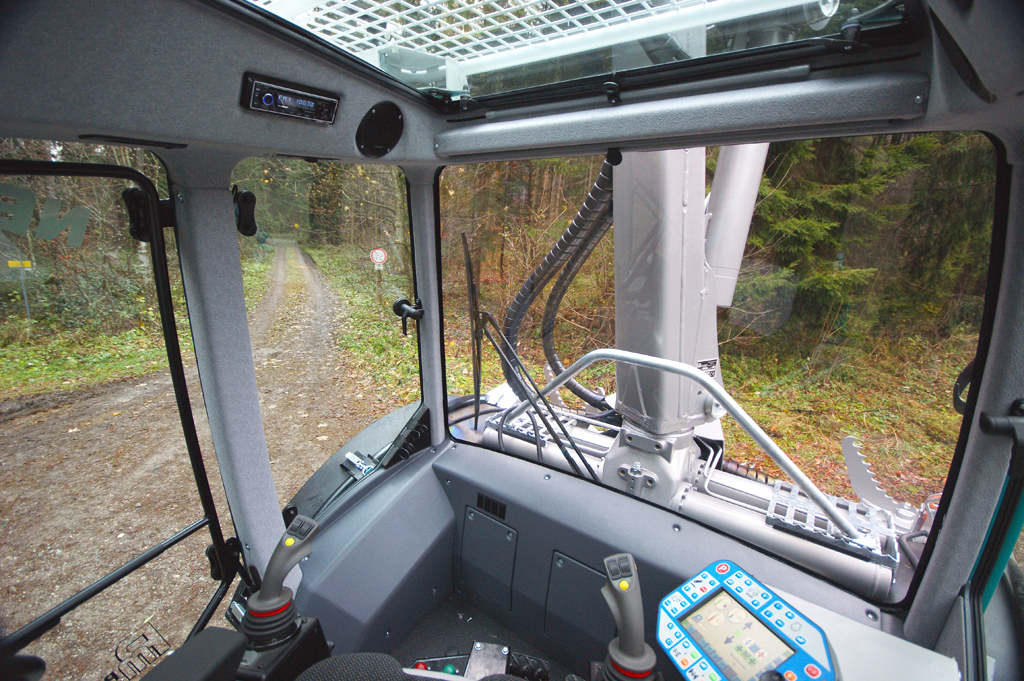 Die größte optische Änderung betrifft wohl die neue Pfanzelt XXL-Kabine. Bereits bekannt vom Forstspezialschlepper Felix wird die pneumatisch gefederte Kabine, die ein ruhiges und schwingungsarmes Arbeiten ermöglicht, nun auch beim Pm Trac aufgebaut. Mit über 7 m2 Glasfläche wurde die Sicht auf das Arbeitsumfeld weiter verbessert. Der Fahrer kann seinen Arbeitsbereich besser einsehen, was den Fahrer entlastet und die Arbeitssicherheit erhöht. Eine entspannte und ergonomische Sitz- und Arbeitsposition findet der Fahrer auf dem nun um 340° elektrisch drehbaren Bedienerstand. Alle Bedien- und Überwachungsfunktionen sind immer im gleichen Blickfeld des Bedieners platziert. Die neue Maschinensteuerung – die über einen Touchscreenmonitor am Sitz bedient wird - erlaubt dabei auch Voreinstellungen für unterschiedliche Fahrer abzuspeichern. Die automatisch gesteuerte Kalt- und Warmluftzufuhr der neuen Klimaautomatik verspricht ein bestmögliches Raumklima und nimmt so positiven Einfluss auf die Fahrerleistung. Das große Raumangebot schafft auch Platz für einen Beifahrer. Zu Wartungszwecken kann die Kabine hydraulisch angehoben werden. Die vorgesetzte Position sichert den Aufbauraum zentral auf der Hinterachse.