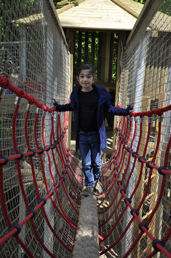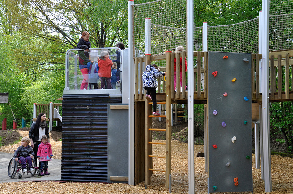 Entsprechend ausgreifend wurde die Anlage geplant, um an vielen Orten die unterschiedlichsten Spielangebote zu ermöglichen. Ob schwerbehindert, mehrfachbehindert oder top fit, jeder kommt zu seinem Recht und kann auf seine Weise diese einladende Spielanlage erfahren. Um eine Anlage auch für behinderte Kinder zu einer Attraktion zu machen, muss als erstes die barrierefreie Zugänglichkeit geschaffen werden. Hier ist sowohl ein Übergang auf Bodenniveau und ein Fahrstuhl integriert worden, der Rollstuhlfahrer sicher auf die höhere Spielebene bringt. Beides für sich schon ein kleines Abenteuer.