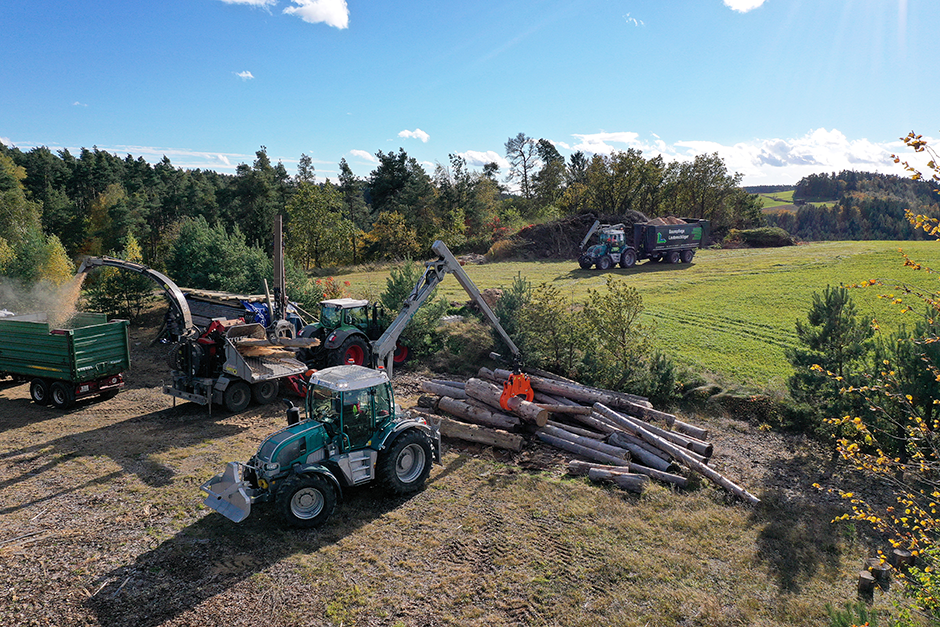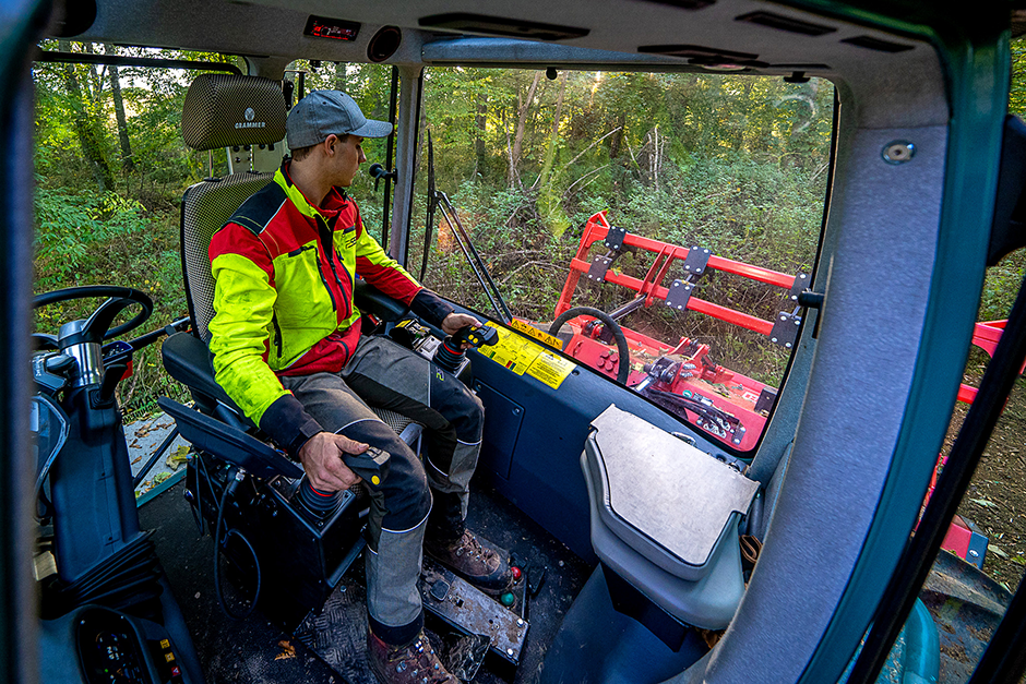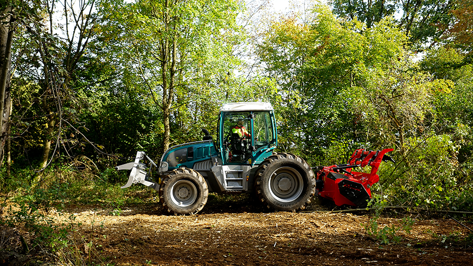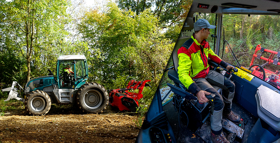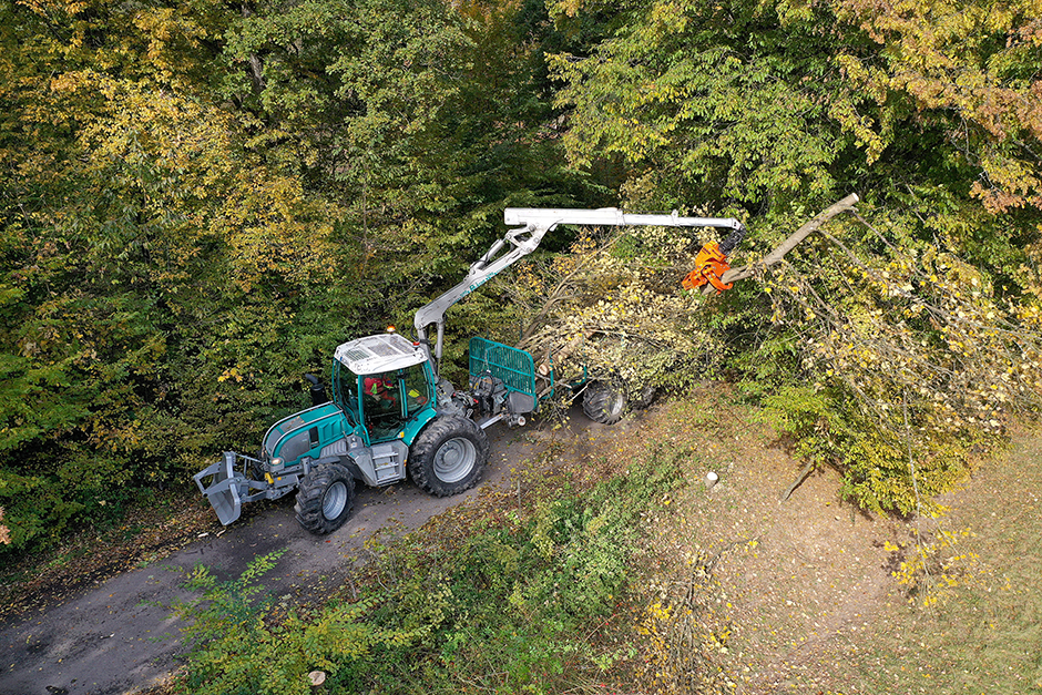 Den werkzeuglosen Auf- und Abbau von Ladekran und Seilwinde ermöglicht die PSA in rund 15 Minuten. Wird der Pm Trac für andere Einsätze benötigt reduziert dies einerseits das Eigengewicht, andererseits stört der Kran auch nicht den Blick auf das Arbeitsgerät. Für den kommunalen Einsatz kann im Heckaufbauraum auch ein Mähausleger kombiniert mit einem Flächenmulchgerät in der Front gefahren werden. Beim Pm Trac dient die PSA als Tragrahmen. Die extremen Kräfte beim Einsatz werden über diesen aufgenommen und kontrolliert abgeführt. Für den kommunalen Einsatz kann statt einer Fronthydraulik auch eine kommunale Kuppelplatte installiert werden.